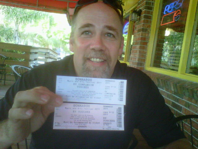 By the way, my blog consultant, Barnsley, told me to never, ever make a blog entry with all text and not single photo. So, here’s a picture of my friend, Stonesy, holding our Bonnaroo 2011 RV Parking Passes. Woo hoo!